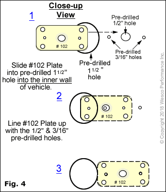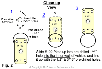 Step # 5: Insert plate and rivet into place. As seen below in Fig. 2, slide the CA53 mounting plate through the 1½" hole up into the inner wall of your vehicle. Line up the pre-drilled holes with the corresponding holes on the mounting plate and hold in position. Then using 3/16" rivets that have a 3/8" shank (reach), insert a rivet into each one of the 2 pre-drilled 3/16" holes and then into the the corresponding holes on the mounting plate and rivet into place.